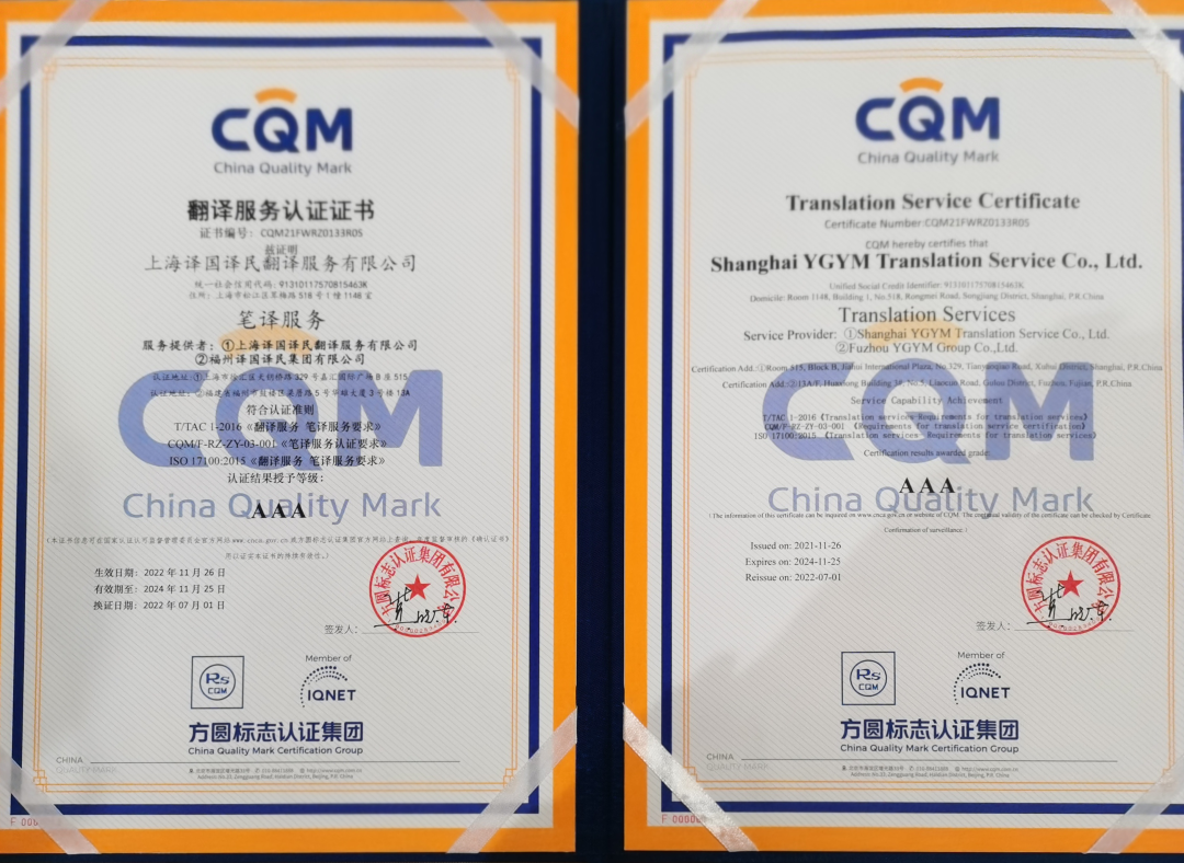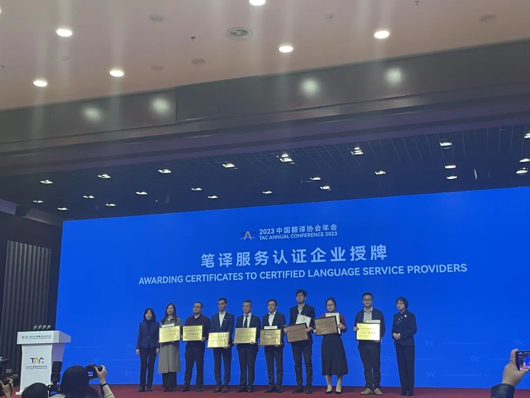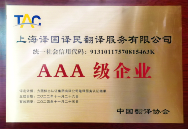 中國翻譯協會在翻譯服務企業認證授牌儀式中,向譯國譯民集團授予了筆譯服務3A級企業服務認證證書。這是譯國譯民集團時隔一年再次獲得3A級語言服務認證,證書充分肯定了該集團的翻譯服務質量、管理體系和人員素質。